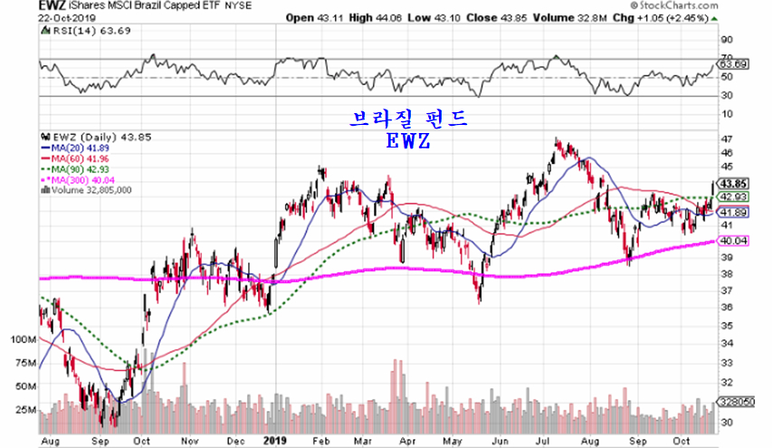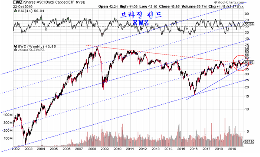 브라질 펀드는 한국 펀드와 같이 2007년 고점과 2011년 고점을 잇는 10년 저항권에서 등락해 왔다. 어제 환율 강세와 함께 주가가 상승을 시작함으로써 2018년 이후의 긴 조정을 마무리하고 선발대로 상승 출발하는 모습으로 투자에 매우 유망하다.