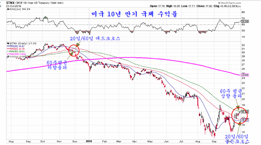 한편, 원유가격, 산업금속, 경기 민감주, 그리고 신흥국 주가지수와 연동이 되어 움직이는 미국 국채 수익률이 2018년 11월 60주 평균 하향 돌파와, 20일 및 60일 평균 데드크로스가 발생하며 하락이 시작된 이후 1년여 만에 60주 평균 상향 돌파와 20일 평균이 60일 평균을 돌파하는 골든 크로스를 앞두고 있다.