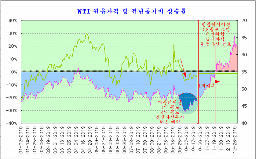 최근 1년 원유가격의 전년동기비 상승률이 -20%에 머물면서, 채권 강세 국면과 달러 강세, 장단기 금리 역전과 디플레이션, 그에 따라 D의 공포와 R의 공포로 시장이 시달려왔다.
