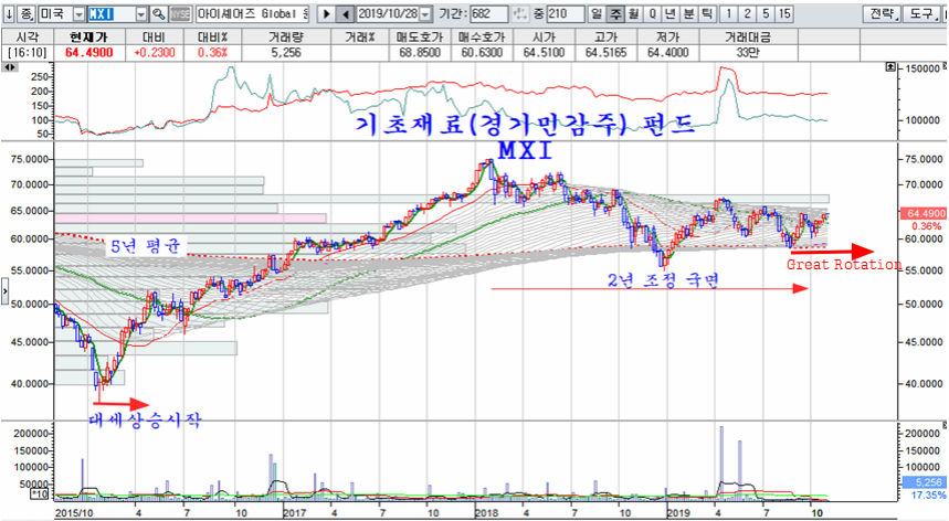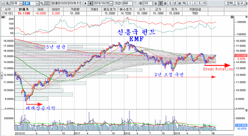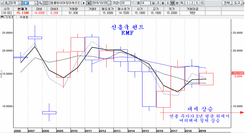 마찬가지로 신흥국 펀드도 2016년부터 대세 상승이 이어지고 있다. 비록 지난해 하락으로 음봉 마감이 되어 대세가 아닌 것처럼 보이지만, 2016년 이후의 상승은 연속적인 것으로 앞으로 이어질 추세와 함께 대세 상승을 이룬다.