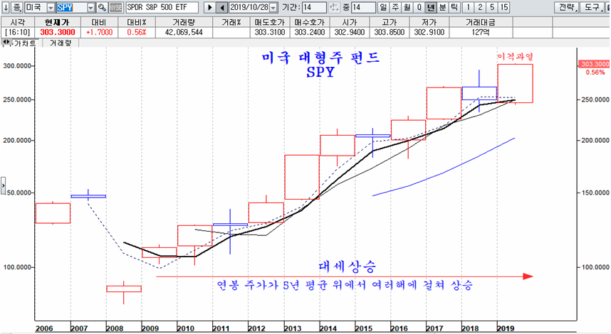 지금 주식 시장은 대세 상승 중이다. 대세 상승이난 연봉차트를 기준하여 주가가 5년 평균선 위로 올라선 후 여러해에 걸쳐 상승이 이어지는 과정으로 정의한다. 이를테면 아래의 연봉 차트에서 2009년 이후의 상승이 대세 상승이다. 주가가 5년(시가3선) 평균위에 올라서 있고, 이 위에서 여러해에 걸쳐 상승이 이어서 나타난다. (물론 도중에 하락하는 해도 있다)