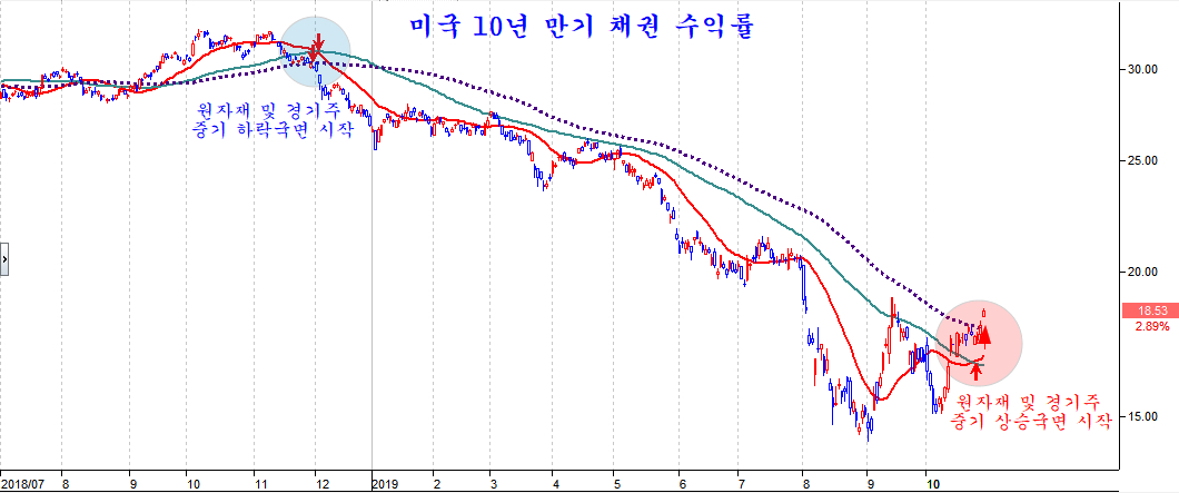 이제 미국의 국채가 20주 평균을 위로 돌파하는 추세적 변화가 시작되고 있다.
