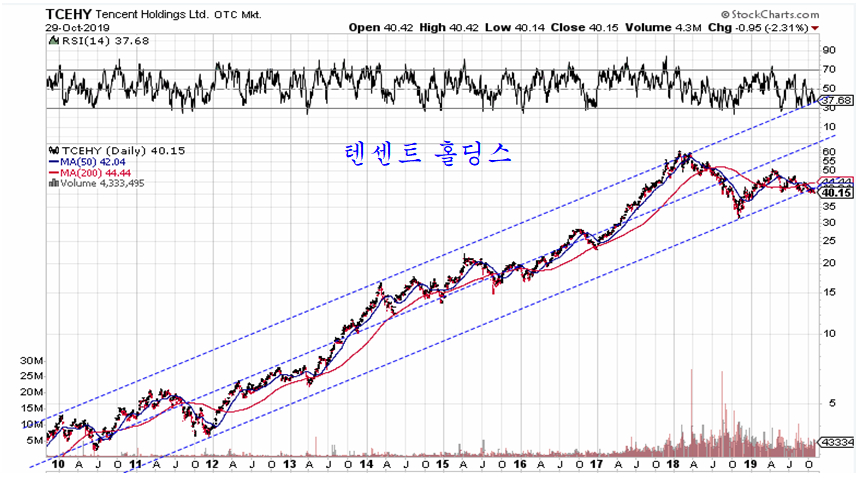 참고로 쐐기형 수렴의 저항 상단을 돌파한 반도체 지수는 채널 고점권으로 저항을 넘어 상승이 더 이어지기 어렵다. 따라서 저항돌파는 일종의 속임이다. 오히려 미국의 기술주를 보유한다면 당분가는 중국의 텐센트로 바꾸어 보는 것이 좋을 것이다.