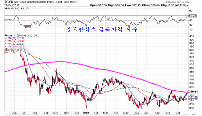 골드만삭스 금속가격 지수도 지난해 6월 60주 평균을 이탈하여 하락 국면이 이어졌으나, 12개월여의 지루한 바닥권 정체 과정을 거쳐 이번 주 60주 평균을 상향 돌파를 시도하며 추세 전환의 변화가 나타나고 있다.