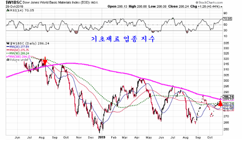 금속, 에너지, 비금속, 목재를 포함하는 글로벌 기초재료(경기민감) 업종지수는 2018년 8월 60주 평균을 하향 돌파한 이래 14개월만에 60주 평균을 상향 돌파하며 추세 변화가 시작되고 있다.