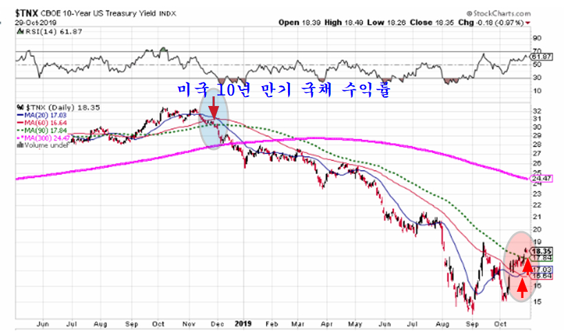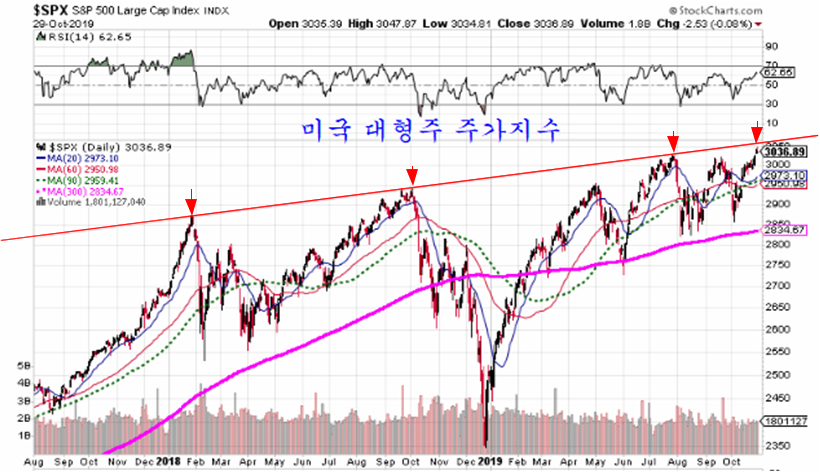 미국 대형주 주가지수가 기술적 저항에 진입하였다. 2018년 1월, 10월, 2019년 7월 고점을 잇는 저항선에 접근해 있어 연말에 이격이 상당한 수준으로 상승한 지금 이 저항을 돌파해 추세를 이어가기가 쉽지 않아 보인다.