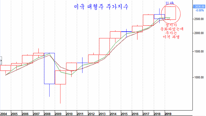 연봉 차트를 기준으로 2019년 주가는 2013년을 제외하면 2019년 이후 가장 큰 상승 폭이다. 그러나 올해 미국 경제가 둔화되었고, 미국 기업의 실적 증가율이 둔화된 점에 비추어 상승은 다소 이례적이며, 이미 과도한 이격 상태로 보아 상승 여력은 제한된다.