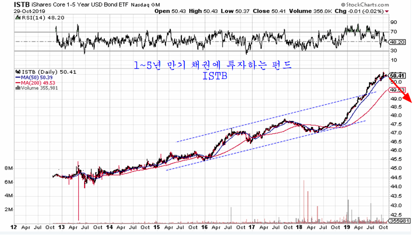만기가 1~5년 남은 채권에 투자하는 채권펀드 ISTB의 움직임을 보면 아직도 채권 가격이 하락하려면 긴 시간이 필요하다. 이 기간 동안 주가가 상승 추세 국면을 유지하기 쉽다.