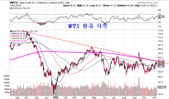 원유가격이 57$을 회복하면서 60주 평균에 접근하였다. 이제 장기 추세 기준인 60주 평균을 상승이 시작되면 장기 상승 추세로 진입하게 된다.