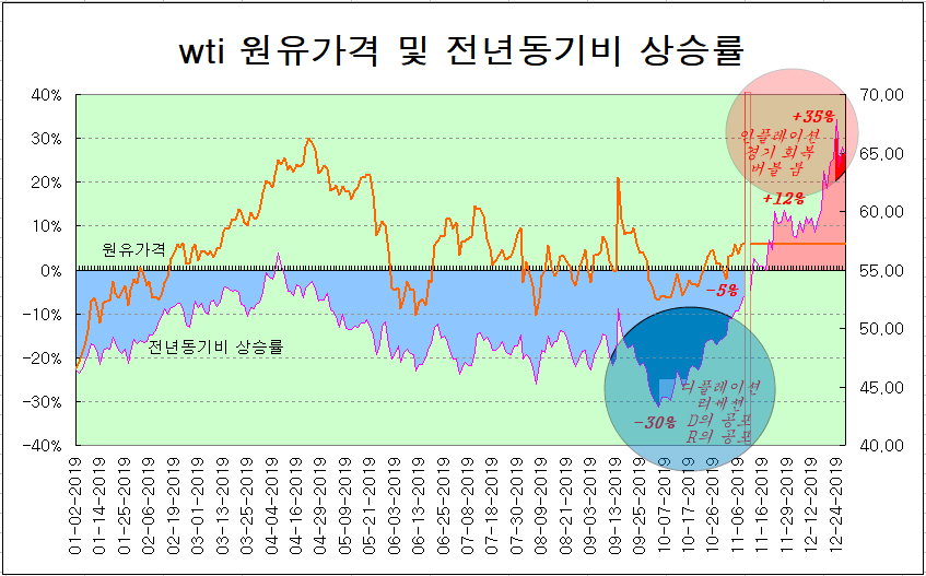 9월 말 -30%의 하락율을 보이며 디플레이션과 리세션(경기침체), 이를 과장하여 D의 공포 또는 R의 공포로 투자자들을 코너로 모는 뉴스가 난무했다. 그러나 원유가격 상승률이 플러스로 반전됨에 따라 디플레이션과 경기침체는 소리 없이 사라지고 인플레이션과 경기 회복이 이를 대체하게 된다.
