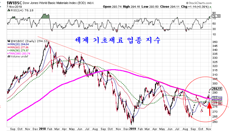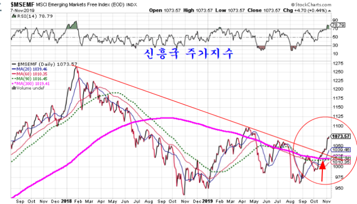 세계 기초재료 업종 지수와 MSCI 신흥국 주가지수는 장기 추세와 하락 저항선을 돌파하여 상승이 시작되고 있다. 불과 한 두주 후에 마무리되는 MSCI 신흥국 제3차 비중 조정이 마무리되면 보다 탄력을 더할 듯 하다.