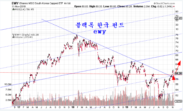 주말과 주초 조정을 보였던 지수는 지지권에서 상승이 시작되고 있다. 블랙록의 한국 펀드 EWY는 돌파했던 12년 저항이 지지가 되며 본격 상승을 준비하고 있다.