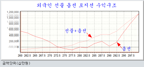 목요일 옵션 만기를 앞두고 외국은은 선물과 옵션 합성 포지션 뿐 아니라 옵션 포지션도 강한 롱포지션을 가져가고 있다. 만기 전에 주가가 하락하기 보다 상승이 쉬운 포지션이다.