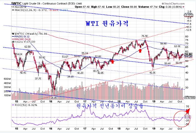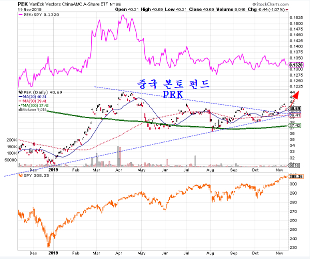 한편, 신흥국과 경기 민감주 주가에 영향을 미치는 중국 본토증시 펀드 PEK가 저항 돌파 후 지지권에 진입함으로써 장기 상승 추세를 준비하고 있다. MSCI 신흥국 펀드에 중국 A주를 편입하는 과정에서 지구한 정체 과정이 이어졌지만, 11월 중순에 다가서 있고 중형주를 중심으로 편입하는 A주의 편입은 시장에 큰 영향을 미칠 수준을 지난 듯 하다.