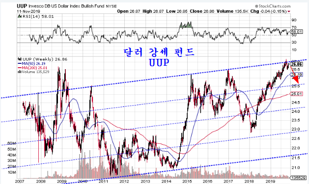 반등했던 달러와 달러 환율도 달러 펀드 UUP가 재차 천정권에 진입함에 따라 하락으로 전환될 전망이다.
