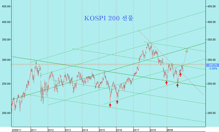 완화된 무역 환경과 더불어 중국 정부의 적극적인 재정정책 및 통화정책 완화를 바탕으로 중국 상해 종합주가지수가 2015년 고점과 2018년 고점을 잇는 저항을 돌파하여 장기 상승 추세를 얻게 된다면, 중국 경제의 영향을 크게 받는 한국도 kospi200 지수는 12년 저항을 재돌파하여 장기적으로 500$에 이르는 장기 상승 국면이 시작될 수 있다.