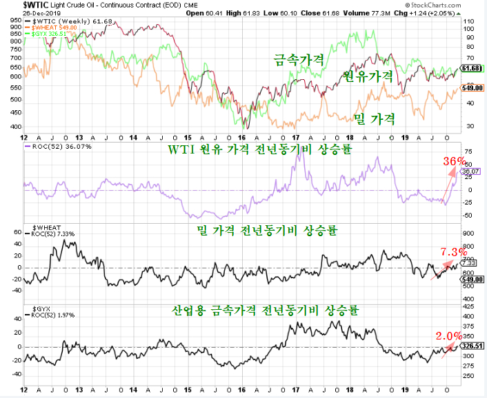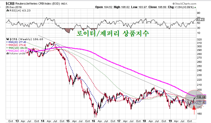 2014년 상품가격이 급락한 이래 5년여에 걸쳐 낮은 상품가격이 이어져왔으나, 2014년 고점과 2018년 고점을 잇는 저항을 돌파하며 상품가격이 오르고 있어 5년여에 걸쳐 이어진 저물가 시대가 저물고 있다.