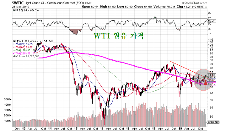 향후 60주 평균을 돌파하게 되면 주가는 수년에 걸쳐 물가가 오르는 인플레이션 국면이 시작된다.