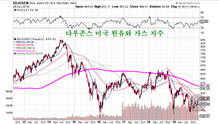 이에 따라 그간 경기주 하락을 리드하던 에너지 관련 주가가 하락 추세를 벗어나 상승이 시작되고 있다. 향후 에너지 섹터 주식은 5년간의 침체를 벗어나 장기 상승이 시작될 듯 하다.