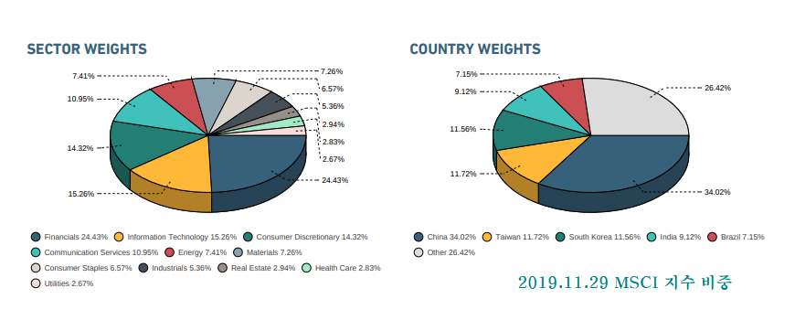 아마도 사우디 석유회사가 편입되면서 다른 신흥국의 화학주 비중이 줄고, 중국의 은행주 비중이 확대되면서 우리나라 은행주 비중이 줄었으며, 중국의 제조업이 편입되면서 이제까지 2위 비중으로 편입되어 있던 한국의 경기주 비중이 줄었기 때문인지 모른다.