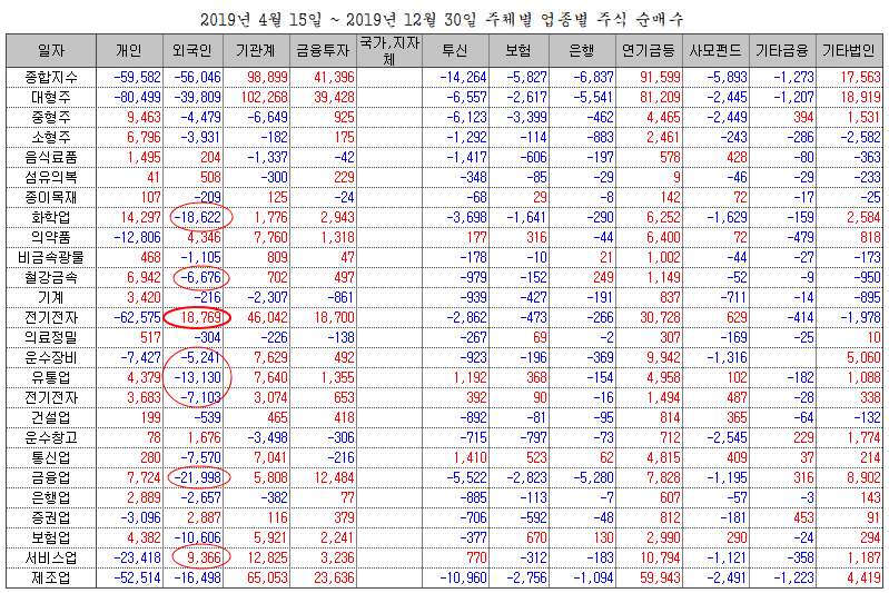 2008년 금융위기 후인 2019년 1월 1일부터 어제까지 11년간 거래소 시장의 업종별 주체별 순매수 결과를 보면 다음과 같다.