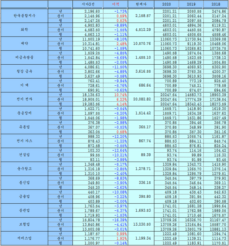 쥬라기: 한편, 업종별 월, 분기, 연간 시가3선은 아래와 같습니다.