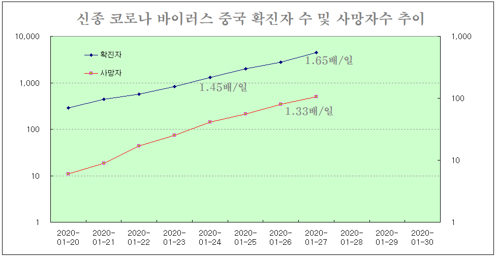 중국 위생건강위원회에서 발표한 확진자 수와 사망자 수 추이는 다음과 같다. 확진자 수는 일평균 1.5배 속도로 증가하고 있고, 사망자 수는 일평균 1.35배 수준의 증가를 나타내고 있다.