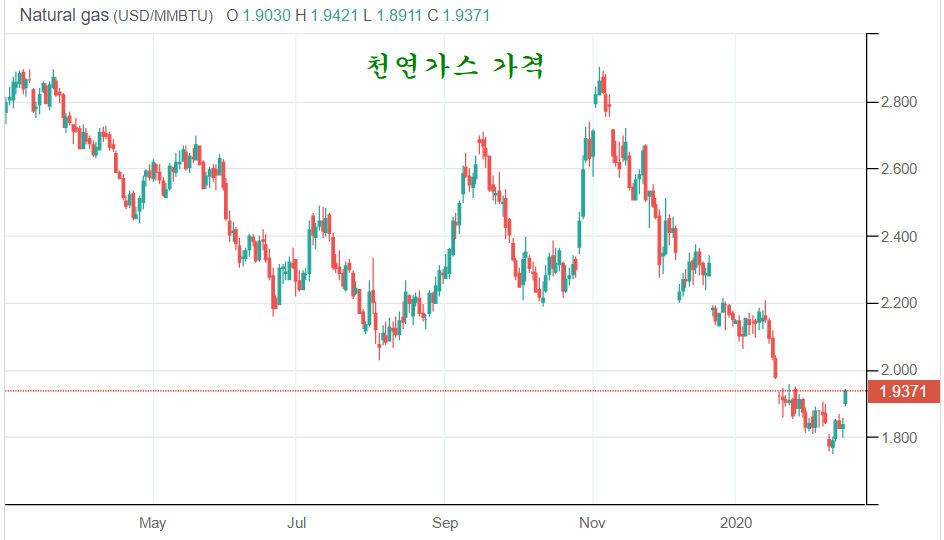 천연가스 가격은 5.5% 오른 1.93$/MM Btu를 나타냈다. 지난해 11월부터 천연가스 가격은 하락이 이어졌고 , 중국의 코로나 사태 발생 이후 가격이 더욱 하락하며 수년래 최저 가격이 되었었는데, 지난주 이후 가격이 반등을 보인 후 어제 강한 상승 갭이 출현하여 추세 반전을 나타내고 있다.