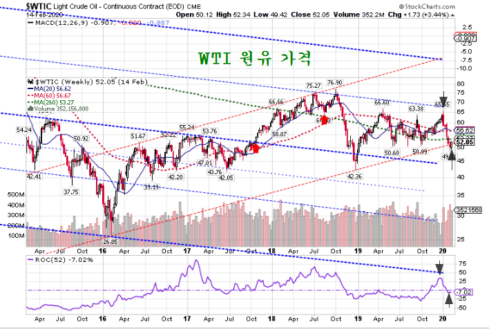 지난해 4분기 호전되는 수급을 바탕으로 꾸준한 상승을 보이며 배럴당 65$을 넘었던 WTI 원유 가격은 미국이 솔레이니마니 제거를 기점으로 하락으로 돌아선 후, 1월말 중국의 코로나 바이러스 폐렴의 확산과 함께 급락하여 배럴당 50$ 아래로 내려선 후 지난주 이후 상승이 이어지고 있다.