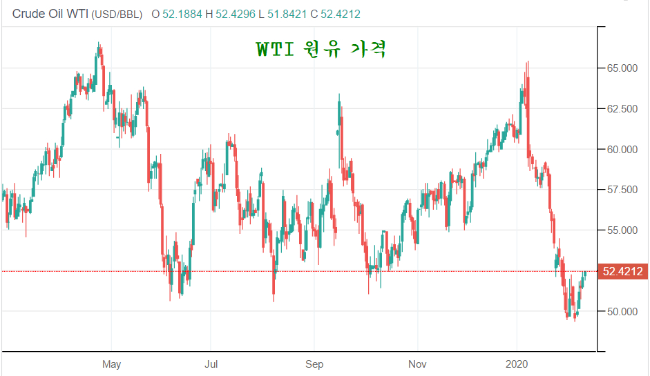 코로나 바이러스에 의한 방역 차단이 강화되면서 원유 수요가 감소를 기대하고 유가가 하락하였으나, 이런 수요 감소의 기대가 과도하게 반영된 가격 수준으로 OPEC이 이에 대응하여 공급을 줄이는 조치나, 올들어 미국이나 유럽 중국의 부동산과 건설 경기가 호전되면서 원유 수요가 증가하는 수급상의 모멘텀을 반영하지 않은 가격이다.