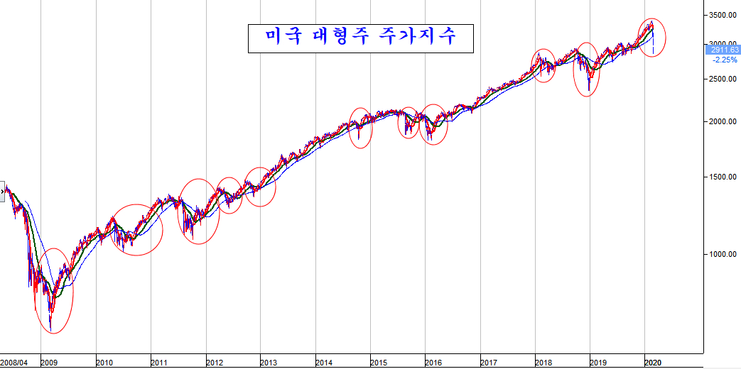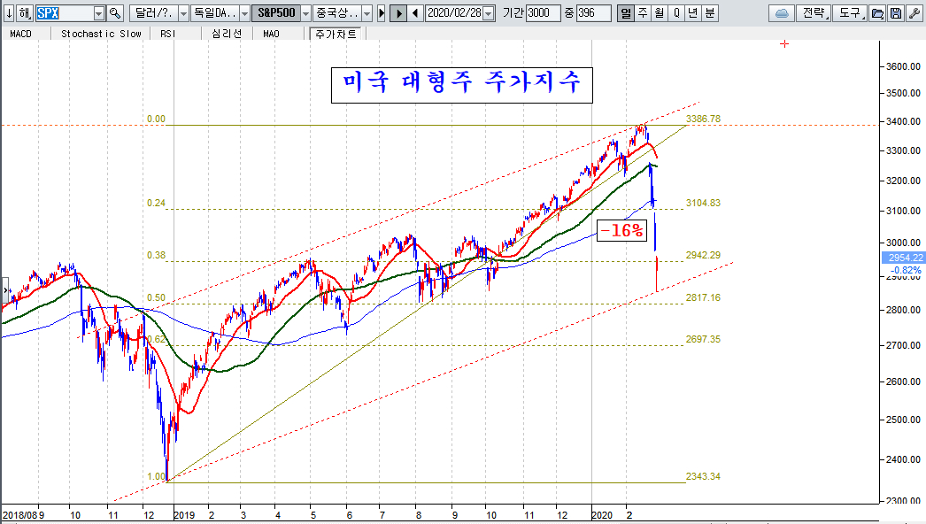 일주일간 16%라는 기록적인 하락을 보인 끝에 미국 대형주 지수는 연봉을 기준 시가3선에 접함으로써 지난해 콜옵션 투기로 과열되었던 주가의 이격을 해소하였다.