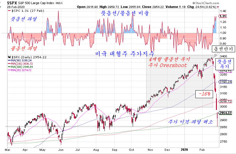 지난주 금요일 옵션 만기를 기점으로 콜옵션 투기가 마무리되고, 풋옵션 투기가 과열되면서 주가는 전례없는 급락이 나타났고 이 과정에서 코로나 바이러스 전염성 폐렴에서 오는 불안감을 십분 활용되었다.