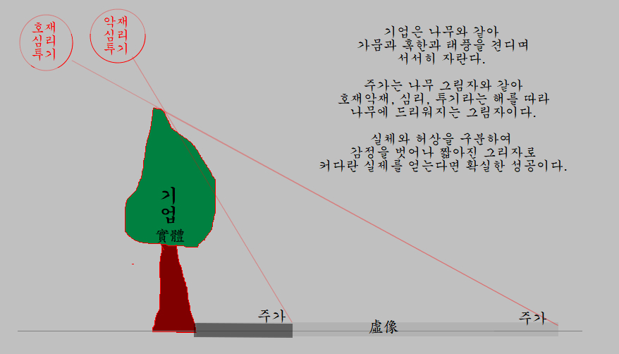 주가는 나무에 호재와 악재, 수급과 심리, 그리고 투기라는 해가 비쳐 드리워진 그림자와 같다. 그림자가 늘거나 준다고 해서 나무가 변하지 않지만, 불안한 투자자들은 허상에 불과한 주가를 두려워하여 나부를 뽑아버리는 우를 범하기 쉽다.