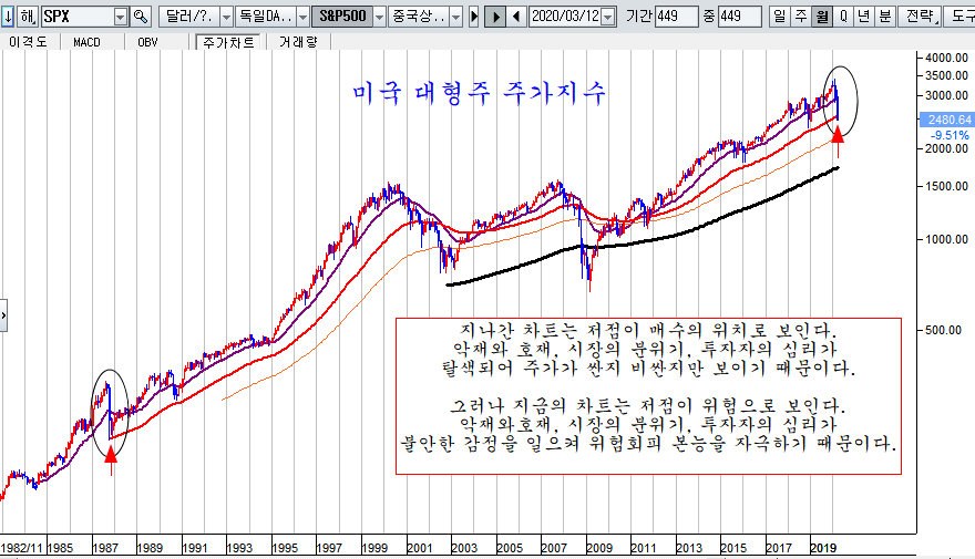 지나간 차트는 바닥인지 천정인지가 잘 보인다. 급한 하락이 투자할 좋은 기회로 보이는 것은 심리를 움직이는 악재와 호재, 시장의 분위기, 그리고 투자의 심리가 완전하게 탈색이 된 때문이다.