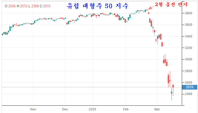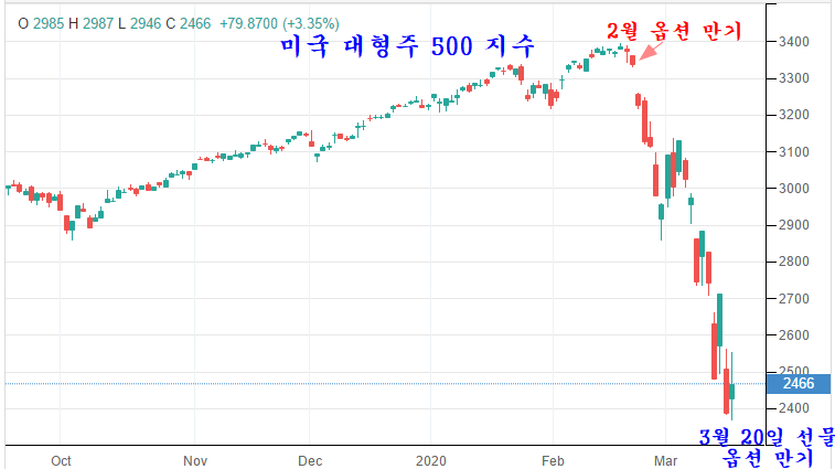 세계 최대 제조업 강국인 중국에 코로나가 전파될 때만 해도 큰 변동이 없었던 세계 증시는 2월 21일 미국과 유럽의 2월 옵션 만기가 끝나면서 파생상품 시장의 투기적인 변동성과 함께 주가가 급락하였다.
