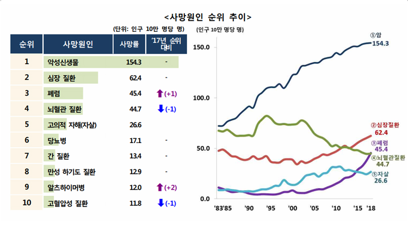 참고로 우리나라 폐렴에 기인한 사망자 수는 2018년을 기준 10만명당 45.4명으로 인구 5100만명을 감안하면 폐렴으로 사망하는 인구는 연간 23,000명에 이르며 그 속도가 빠르게 증가하고 있다.