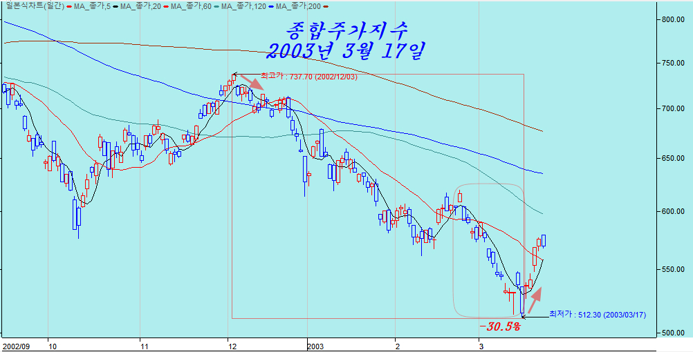 17년 전인 2003년 주가는 대세 상승을 앞두고 주가가 급락하였다. 2002년부터 12월부터 시작된 시작된 주가 하락은 2월 만기를 앞두고 미국의 이라크 침공을 앞두고 주가가 급락하였고, 한국의 옵션 만기기 끝난 다음주인 3월 17일을 최저점으로 하여 하락을 멈추고 주가가 상승하였다. 2002년 12월 고점 이후 종합지수 하락 폭은 30%였다.