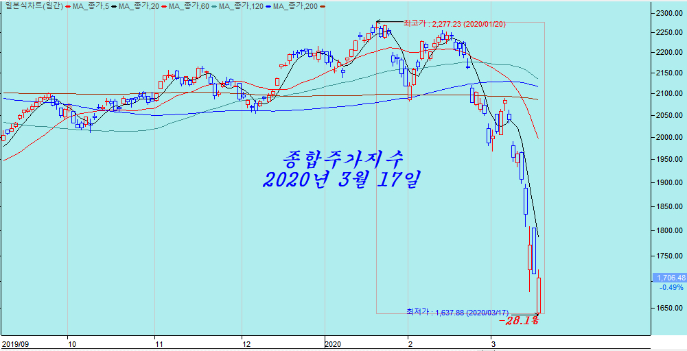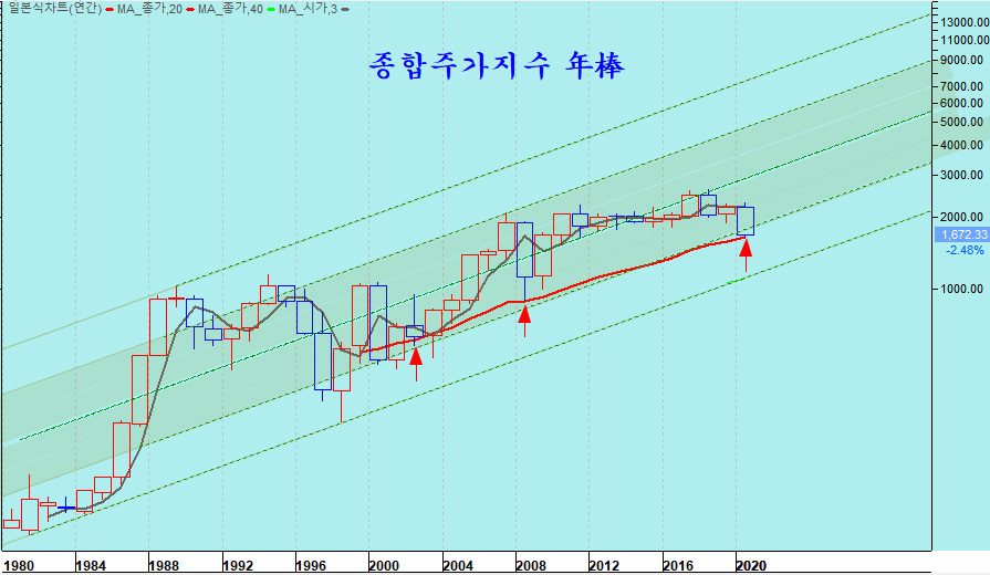 연간차트로 보는 종합지수는 아래와 같다. 3월 17일 최저점으로 연봉에서 20년 평균을 찍었다. 2008년 금융위기 때 찍고 올라간 지지선이 20년 평균이다.