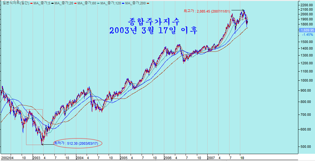 17년전의 3월 17일 최저점을 만든 이후의 주가 움직임은 다음과 같다.
