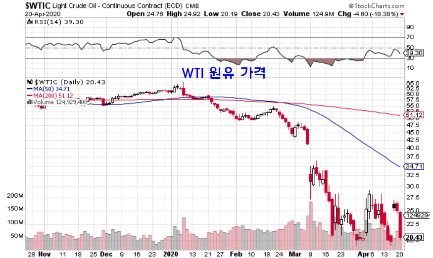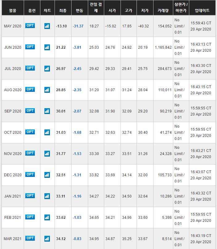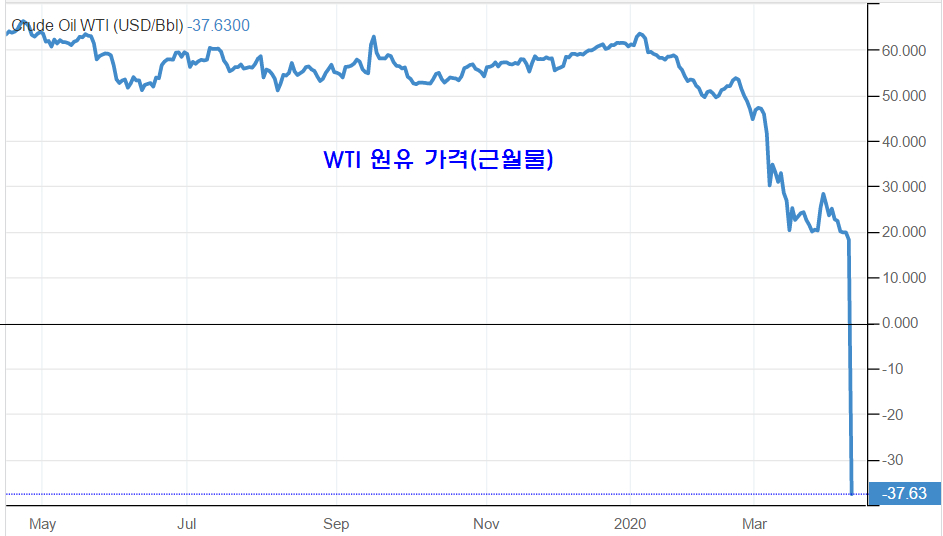 20일 원유 선물 시장에서 원유 가격은 21일 만기를 앞두고 마이너스로 추락했고 이런 가격 하락은 만기인 오늘까지 이어지며 배럴당 -37.63$을 나타내고 있다.