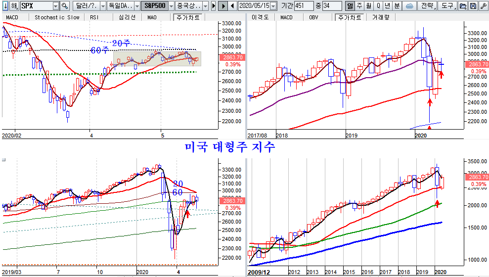 미국 대형주 주가지수는 주초 60주 평균에 접근한 후 조정을 거쳤다. 월간 기준 시가3선 저가 매수권을 확인한 후 반등이 나타났으며 새로운 옵션 거래와 함께 20주 및 60주 평균 돌파가 관심이 된다.