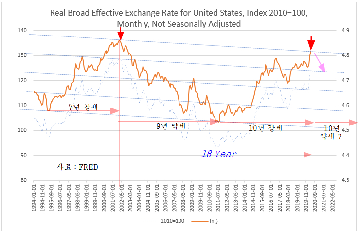 미국 달러의 무역 가중 실질 평균 환율이 2002년 이후 18년 만에 대세 핵심도의 천정에 접하면서 반전의 예상되는 위치이며 향후 10년 달러 약세와 글로벌 인플레이션이 시작될 듯 하다.