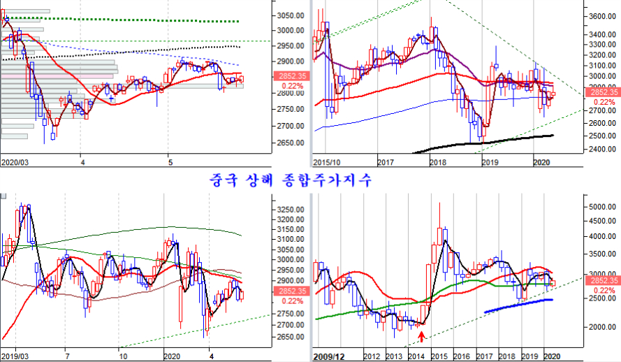중국 상해 종합주가지수는 셋째 주 하락에도 불구하고 마지막주 상승폭은 1.37%에 머물며 상승이 뒤쳐져 있다. 그러나 주가가 10년 조정 국면과 함께 대세 채널의 최 하단에 머물러 상승이 기대되는 위치이다. 특히 2019년 4월을 고점으로 조정이 시작된 후 글로벌 자산운용사의 주식 비중 확대와 함께 14개월째 조정 국면을 거치고 있다.