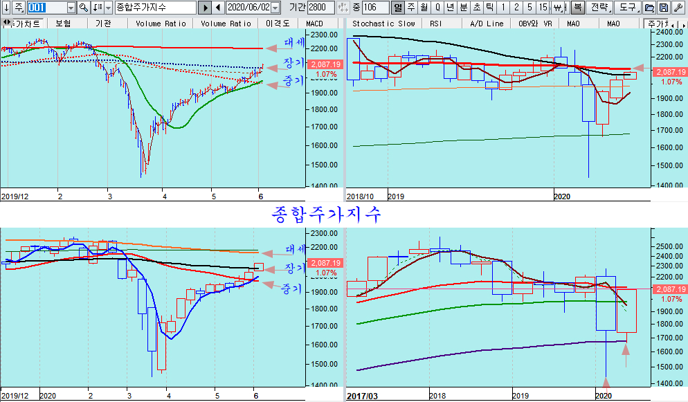 종합주가지수가 장기 추세 기준인 60주 평균 위로 올라서면서 장기 추세 상승 국면으로 진입을 시도하고 있다. 미국이나 일본 등 주요 증시가 이미 60주 평균선을 넘었고, 코스닥 지수나 음식료 제약 등 주요 업종이 이미 60주 평균선을 넘어 있어 종합지수 역시 60주 평균을 지지로한 장기 추세가 시작된다고 할 수 있다.