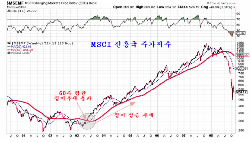 60주 평균 장기 추세의 돌파는 다음과 같은 의미를 가진다. 다음은 신흥국 주가지수가 2003년 장기 추세 기준 60주 평균을 돌파한 후의 주가 추이이다. 장기 추세선을 돌파한 이후 이 추세가 꺾이기 까지 몇년간 또는 몇개월간 상승하는지 확인해 두면 좋을 것이다.