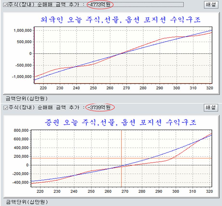 외국인은 장마감 선물 14,000계약을 매수하였고, 증권은 하락할 때 선물과 옵션을 롱포지션으로 확대하였으며, 일반은 1조 2400억원 규모의 주식 순매수와 함께 옵션 매수를 강화하였다. 주식과 선물 그리고 옵션 포지션을 모두 합한 수익구조는 지수가 상승하면 이익을 얻는 포지션을 갖추었다. 마치, 바둑이나 장기 게임을 할 때 포석을 놓는 것과 같다.