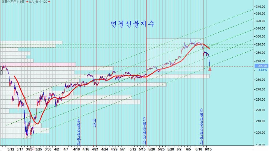 연결선물지수는 6월물 선물 거래와 함께 상승해던 변동을 모두 반납하고 4월 이후 매집 가격대로 회귀하였다. 6월 파생상품 거래를 상승의 변동으로 끝내고 지수를 5월 옵션 만기 출발전 수준으로 되돌린 결과를 준다.