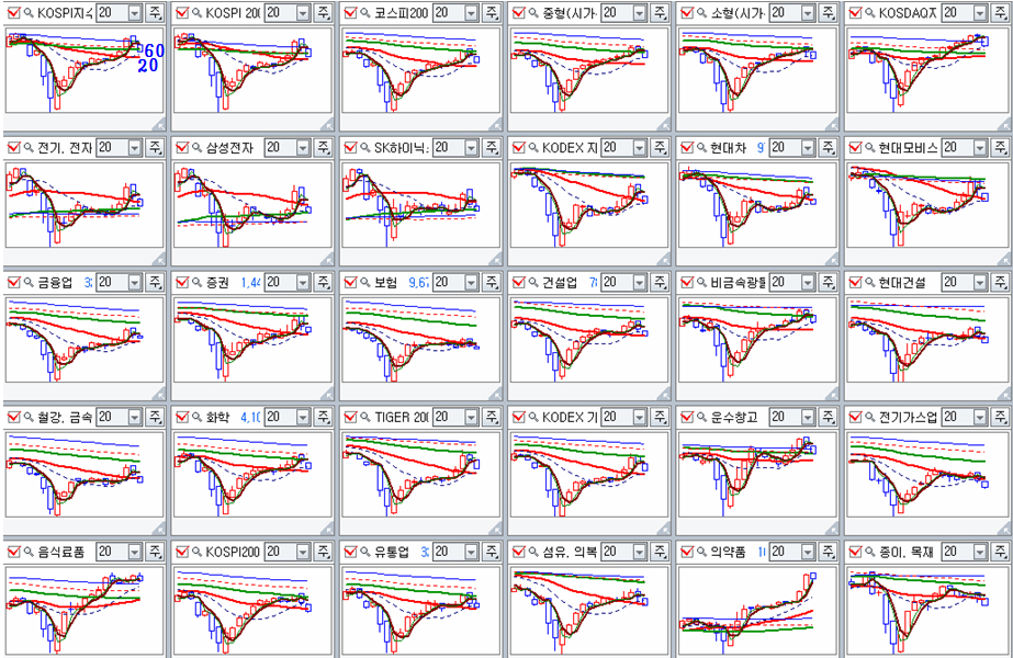 주요업종의 지수는 중기 추세선인 20주 평균을 돌파한 후 다시 20주 평균으로 회귀함으로써 되돌림 지지권이다. 분기말 이격이 해소된 상태이므로 6월에 이어 7월에도 이어질 상승을 겨냥한 상승이 유망한다.
