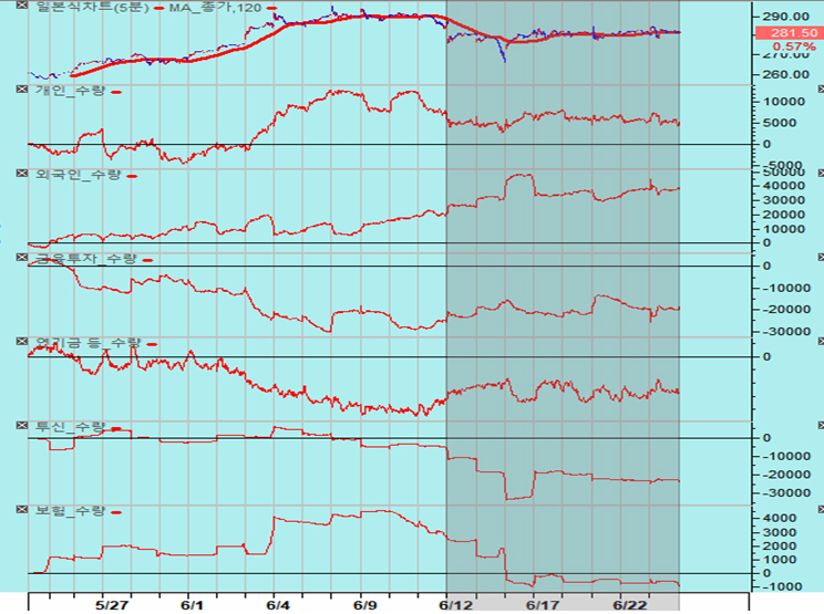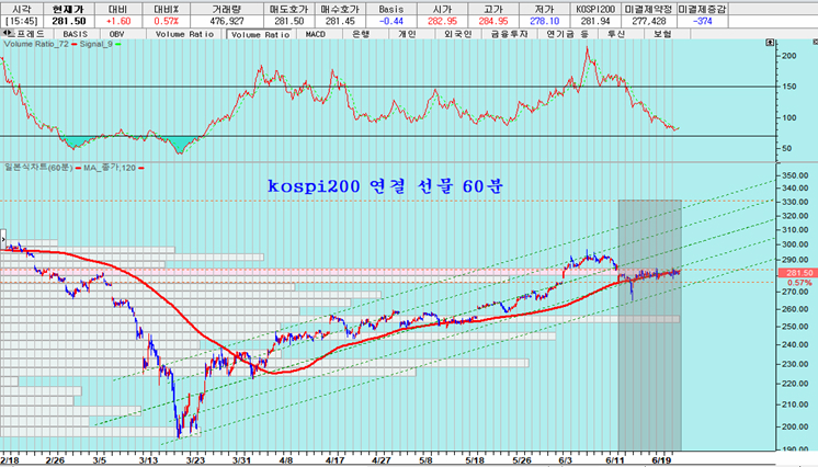 6월 12일 선물 옵션 만기 이후 파생상품 게임의 사전포석을 위한 급락과 급등 이후 2주 가까운 정체가 이어졌지만 기술적으로 또 경기 모멘텀으로 주가가 상승할 준비가 완비된 듯 하다.