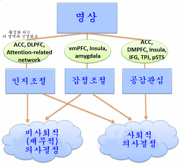 따라서 명상은 주의 집중 능력을 통해 산만함을 벗어나고, 작업기억의 능력을 향상하며, 목표 과제에 몰입하게 함으로써 인지 능력을 개선하고, 감정 조절을 통해 감정에 치우친 사고의 편향을 조절하며, 공감 능력 및 타인에 대한 관심 즉, 자애심을 통해 자신 뿐 아니라 타인에 대한 배려를 개선함으로써 경제적, 사회적, 일상적 의사결정을 합리적으로 하는데 효과를 준다.